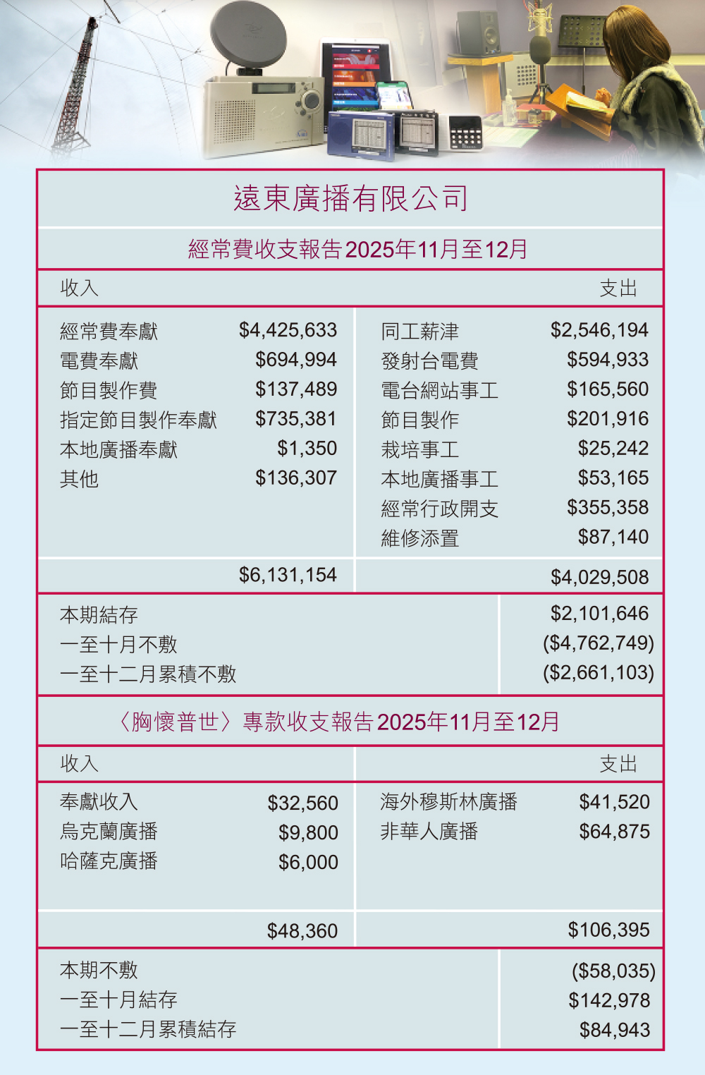 远东广播公司是信心差会,庞大的经费和广播开支,完全凭信心仰望神的供应。过去半个世纪,神借着教会和信徒的奉献,成就了很多人看来是不可能的事。恳请你记念本会的经济需要,支持我们继续藉福音广播真道,给听众带来生命的改变和转化!